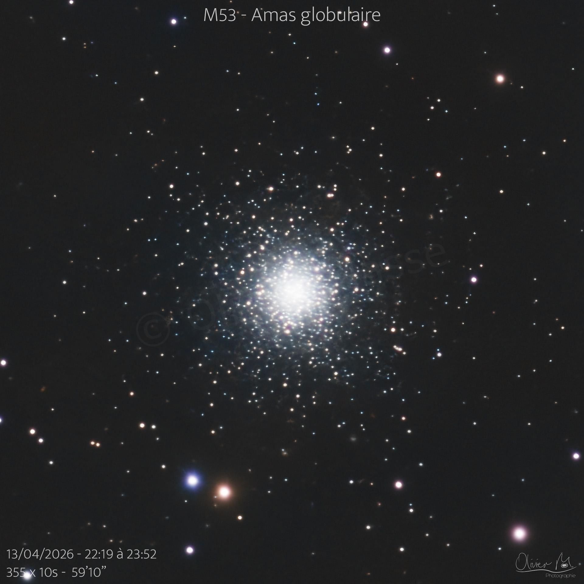 #12 – M53 – Amas globulairePar Olivier / 13 avril 2026 Seestar S50 EQ Mode13/04/2026 - 22:19 à 23:52355 x 10s - 59’10’’